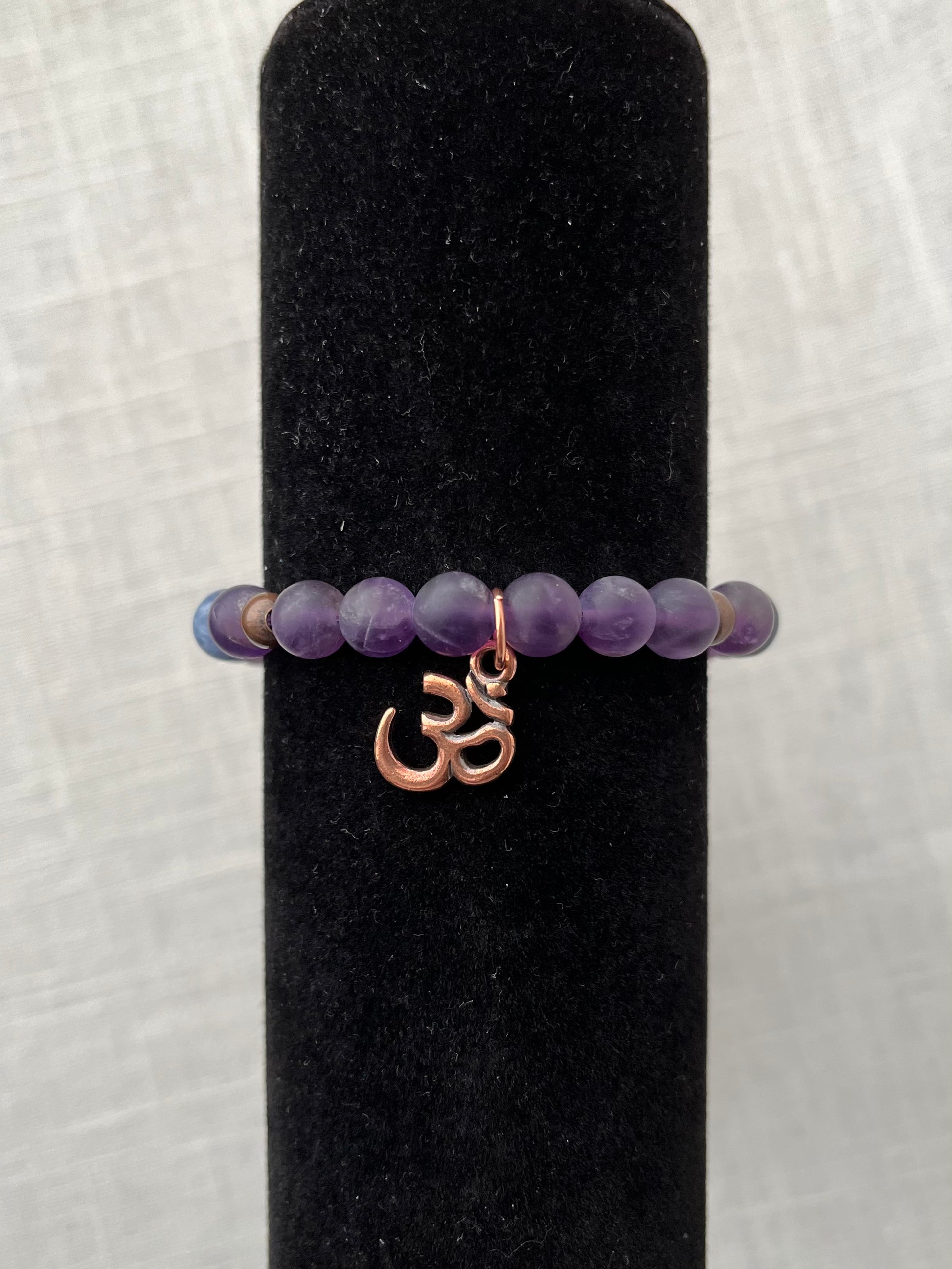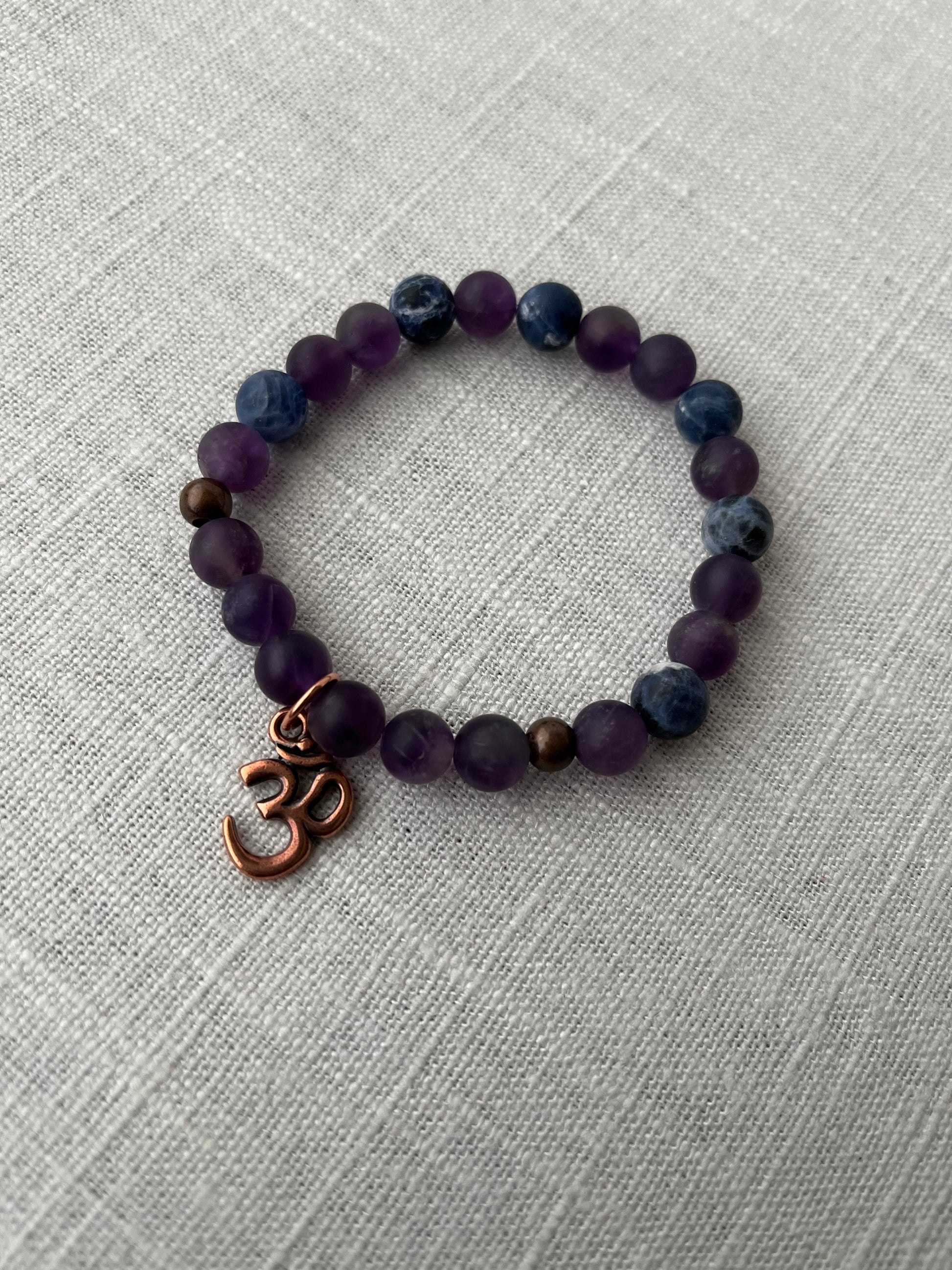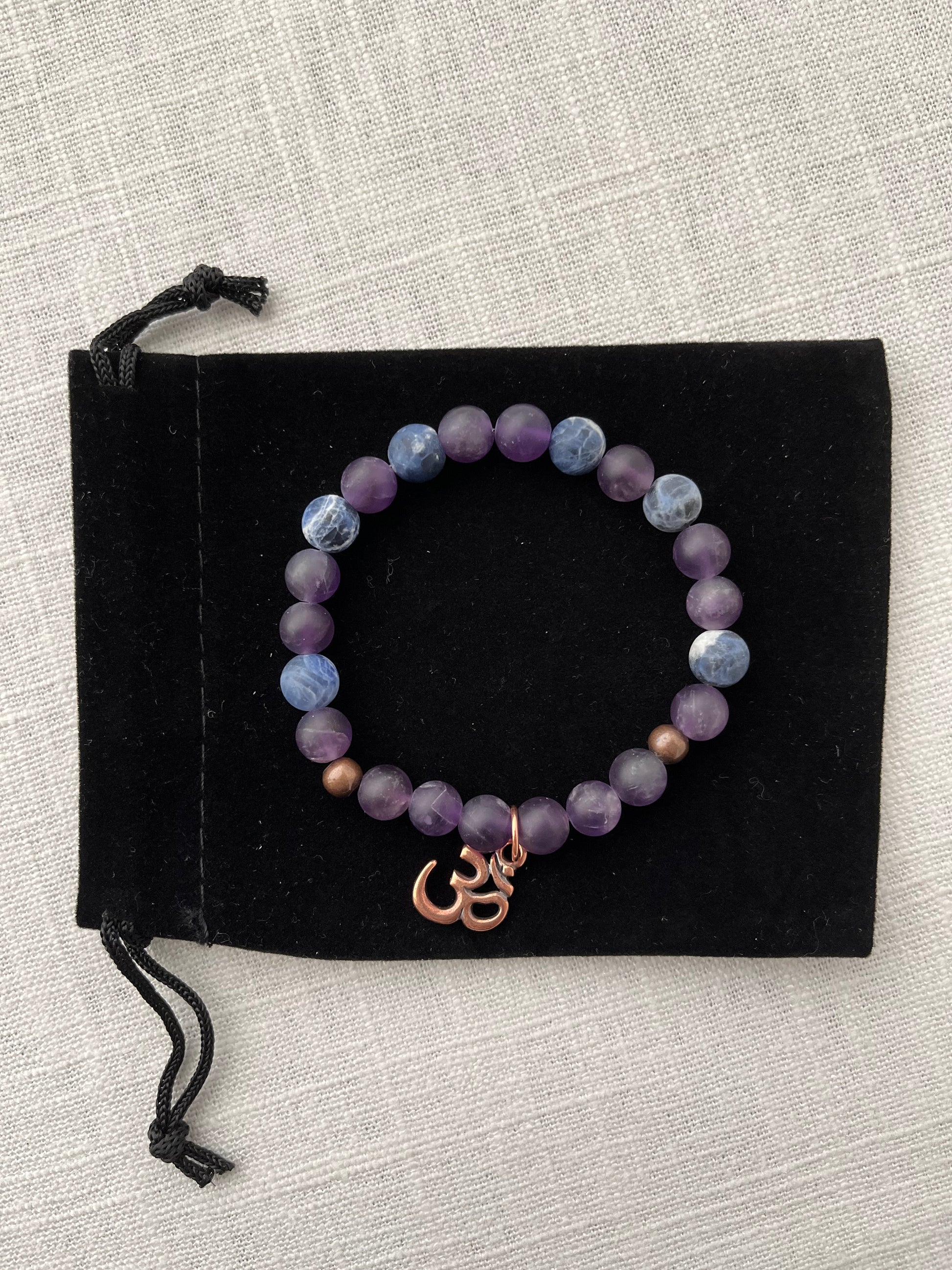 Sodalite is a self-empowerment stone. This crystal will aid in releasing tension and fears as it helps you understand the circumstances in which you find yourself. Sodalite eliminates confusion and intellectual bondage and promotes trust, truth, and inspiration. This will connect to the third eye and throat chakras. It also clears electromagnetic pollution. Amethyst attracts peace of mind, abundance, and emotional balance. It connects with the crown chakra for spiritual wisdom. Ohm is a sacred symbol in Indian religions that symbolizes the essence of the ultimate reality and the harmony of mind, body, and soul.
