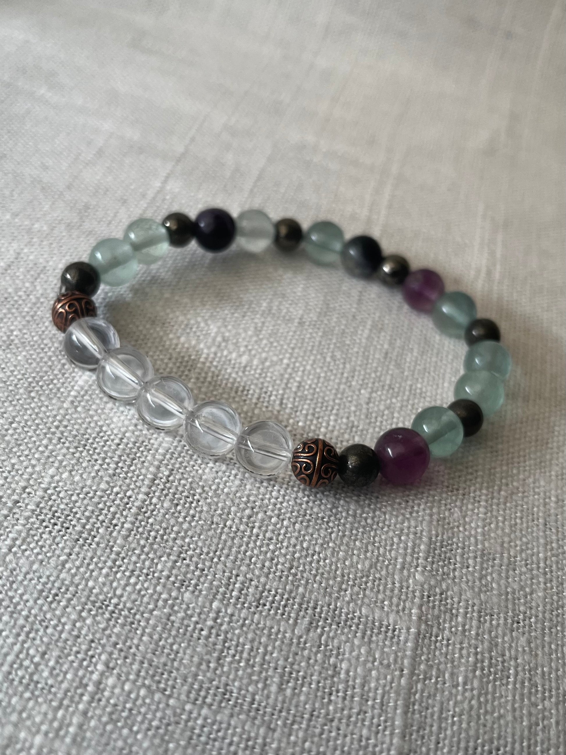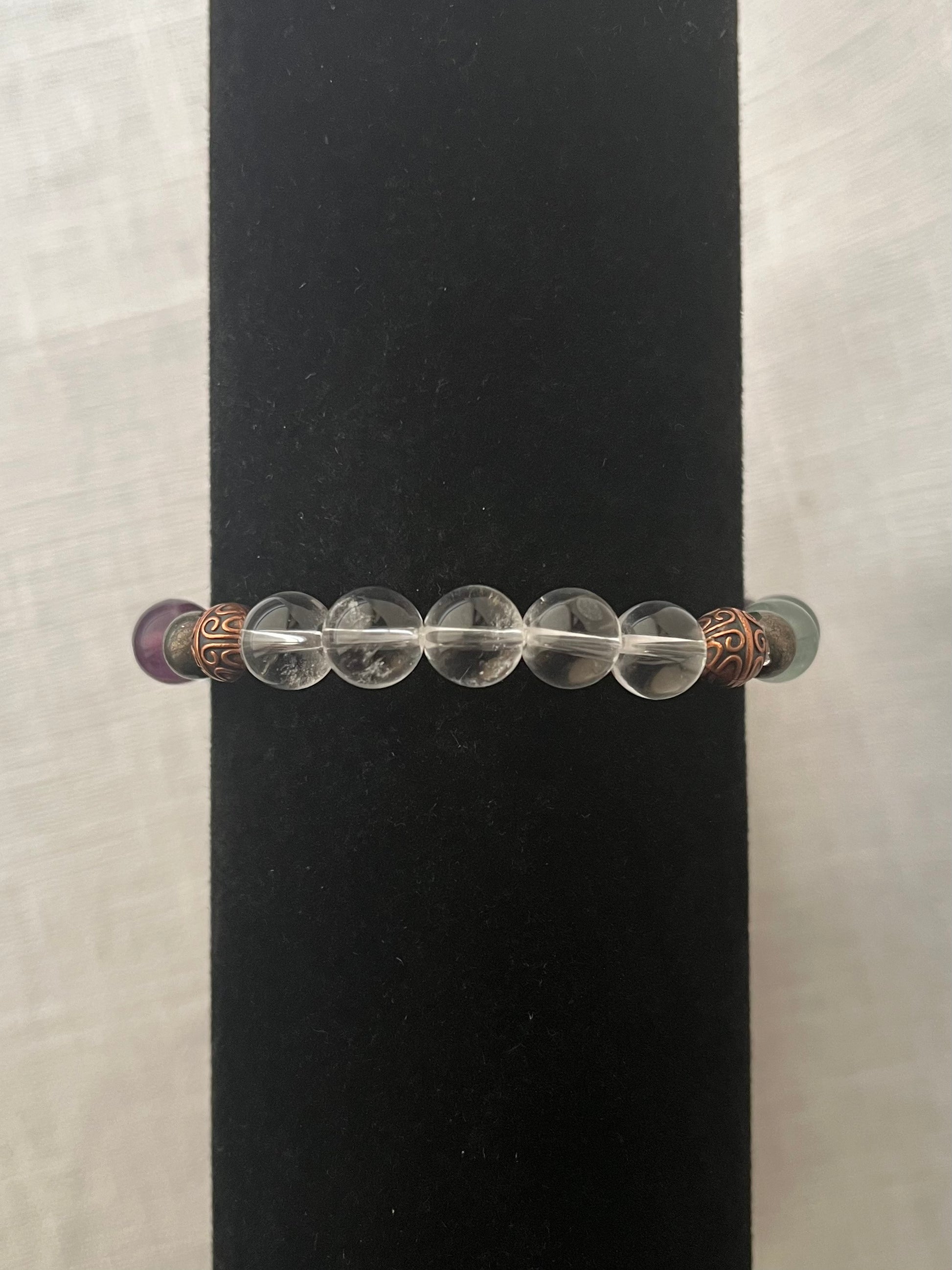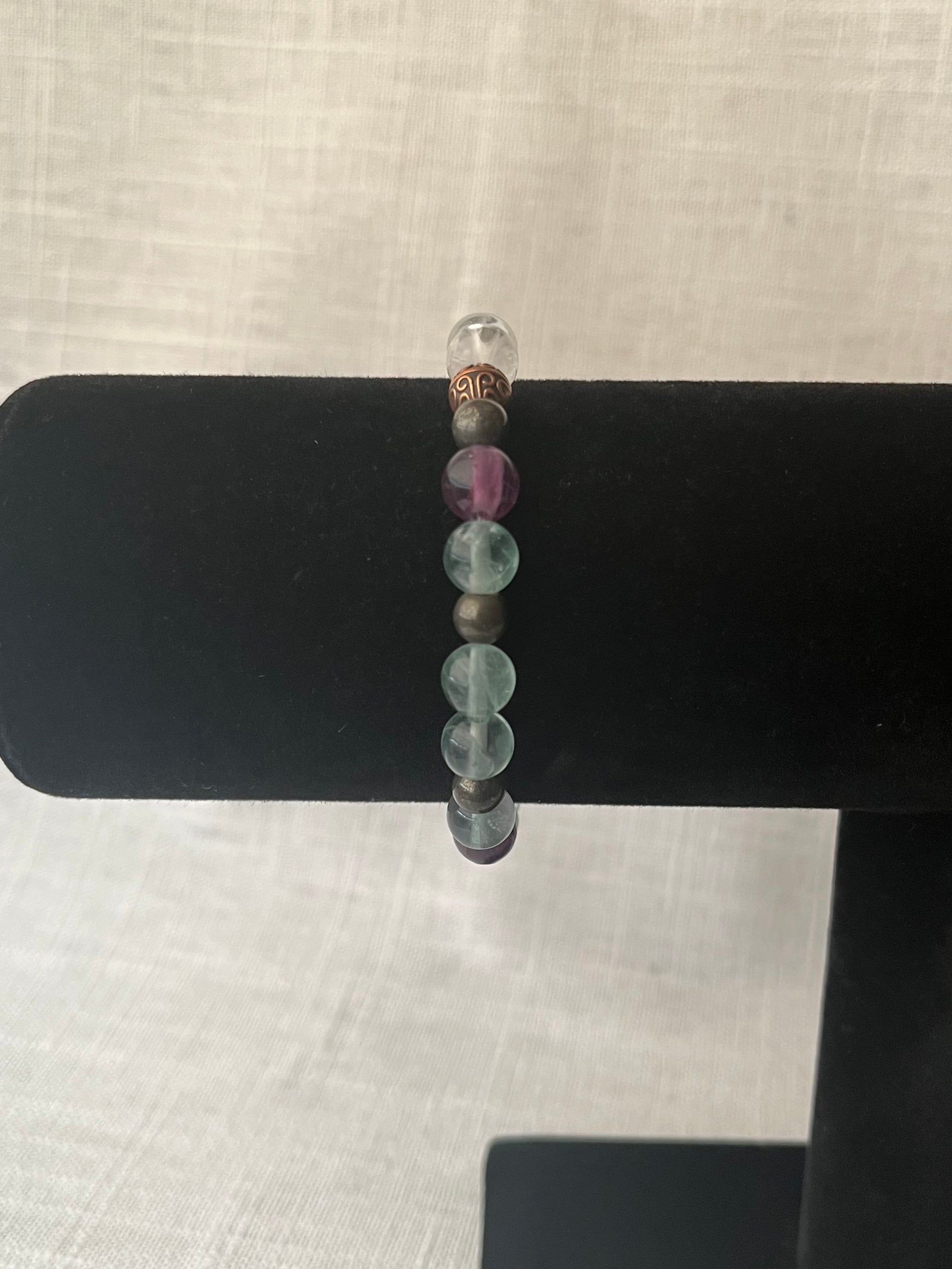 This bracelet fits 7” wrists or smaller. Fluorite and clear quartz beads are 8mm. Pyrite beads are 6mm.