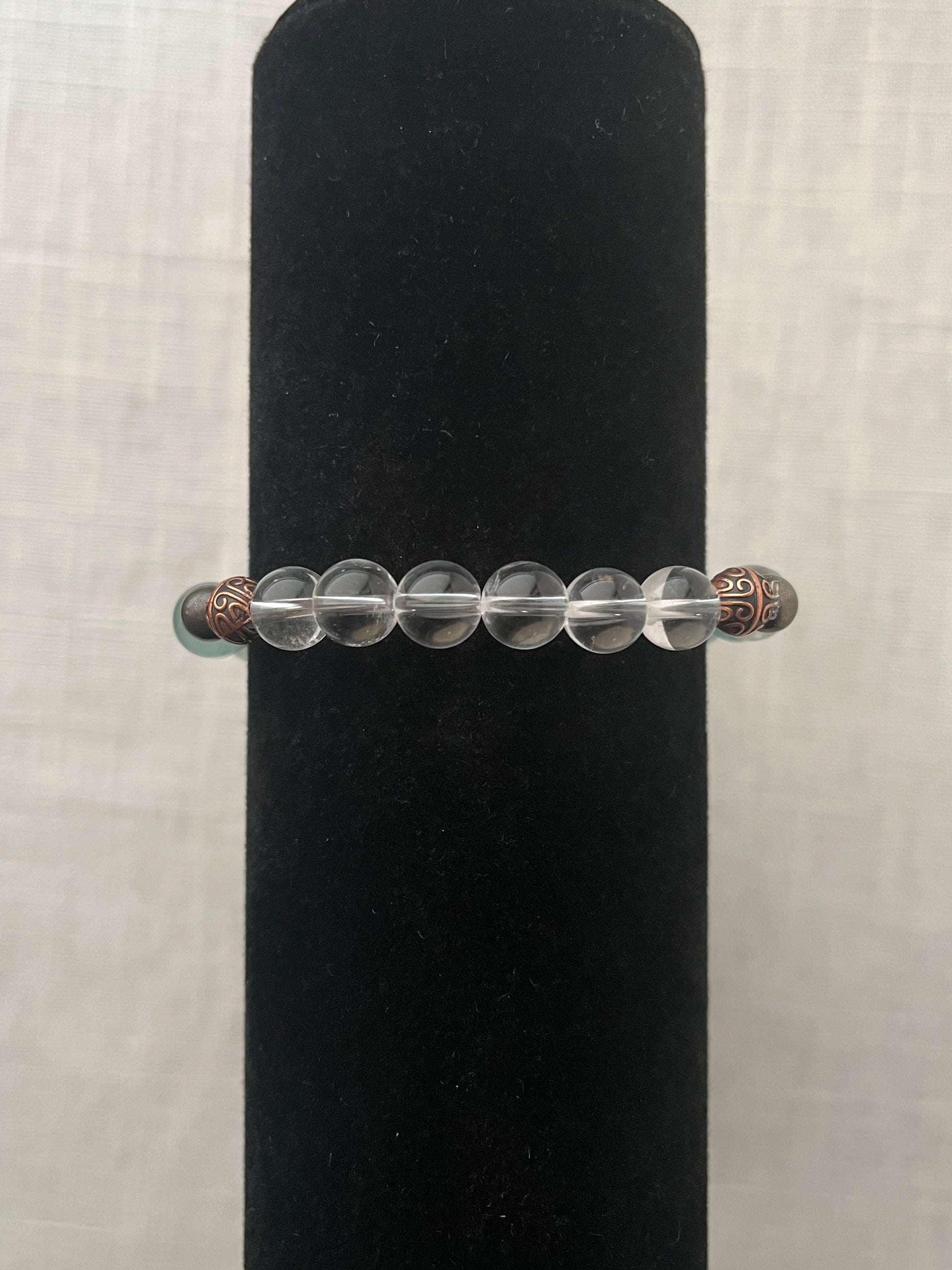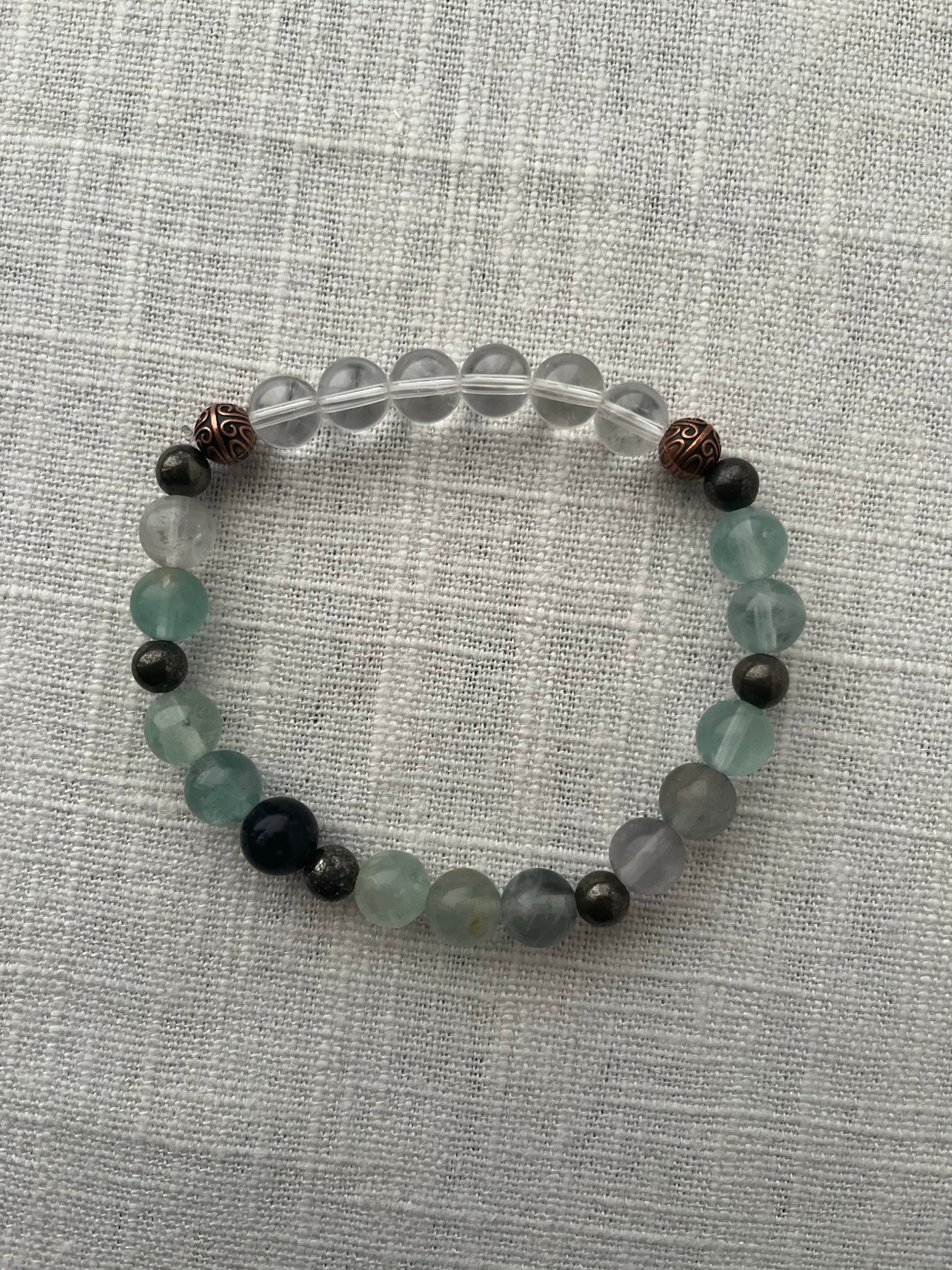 This bracelet fits 7.5” wrists or smaller. Fluorite and clear quartz beads are 8mm. Pyrite beads are 6mm.