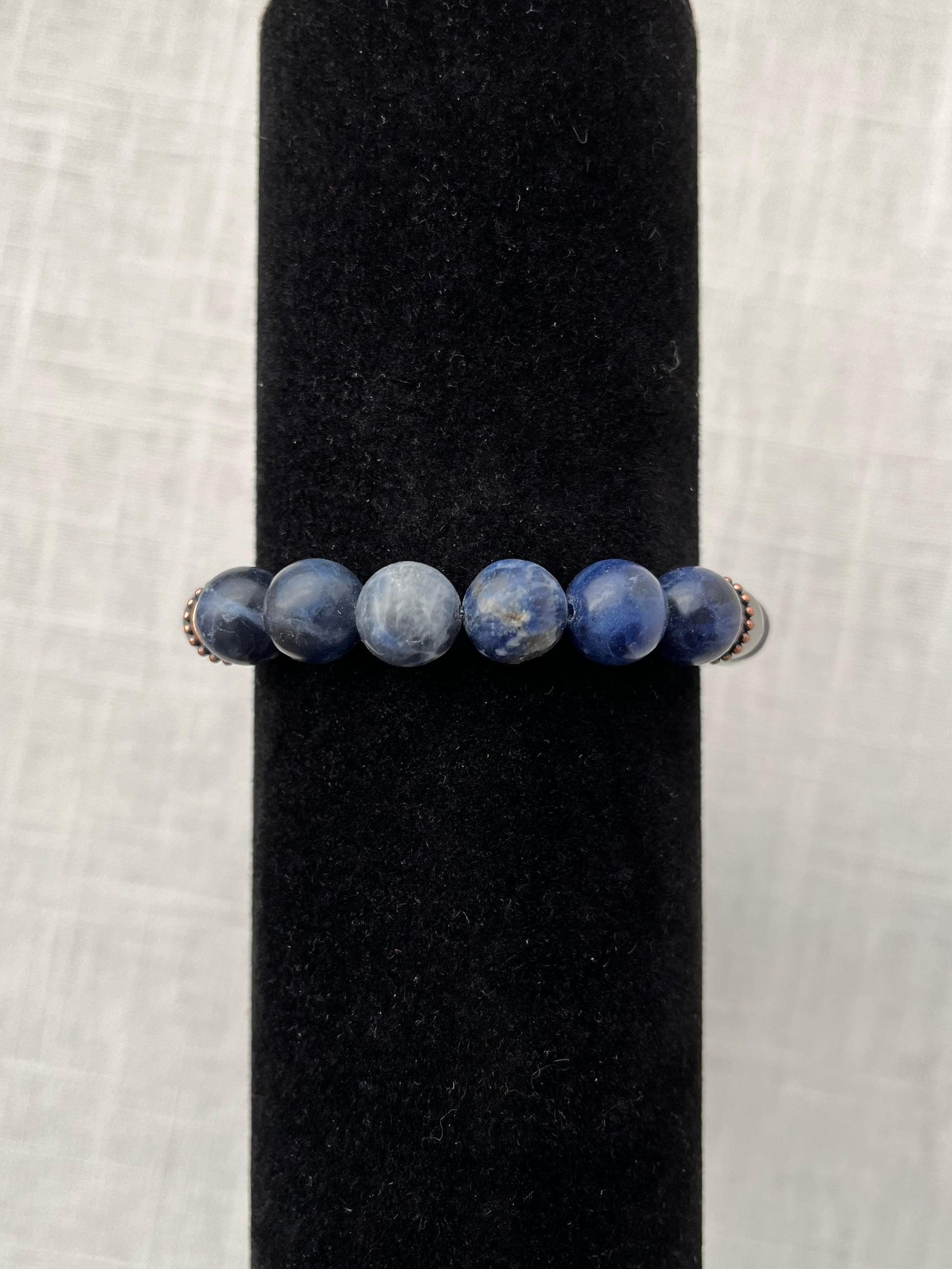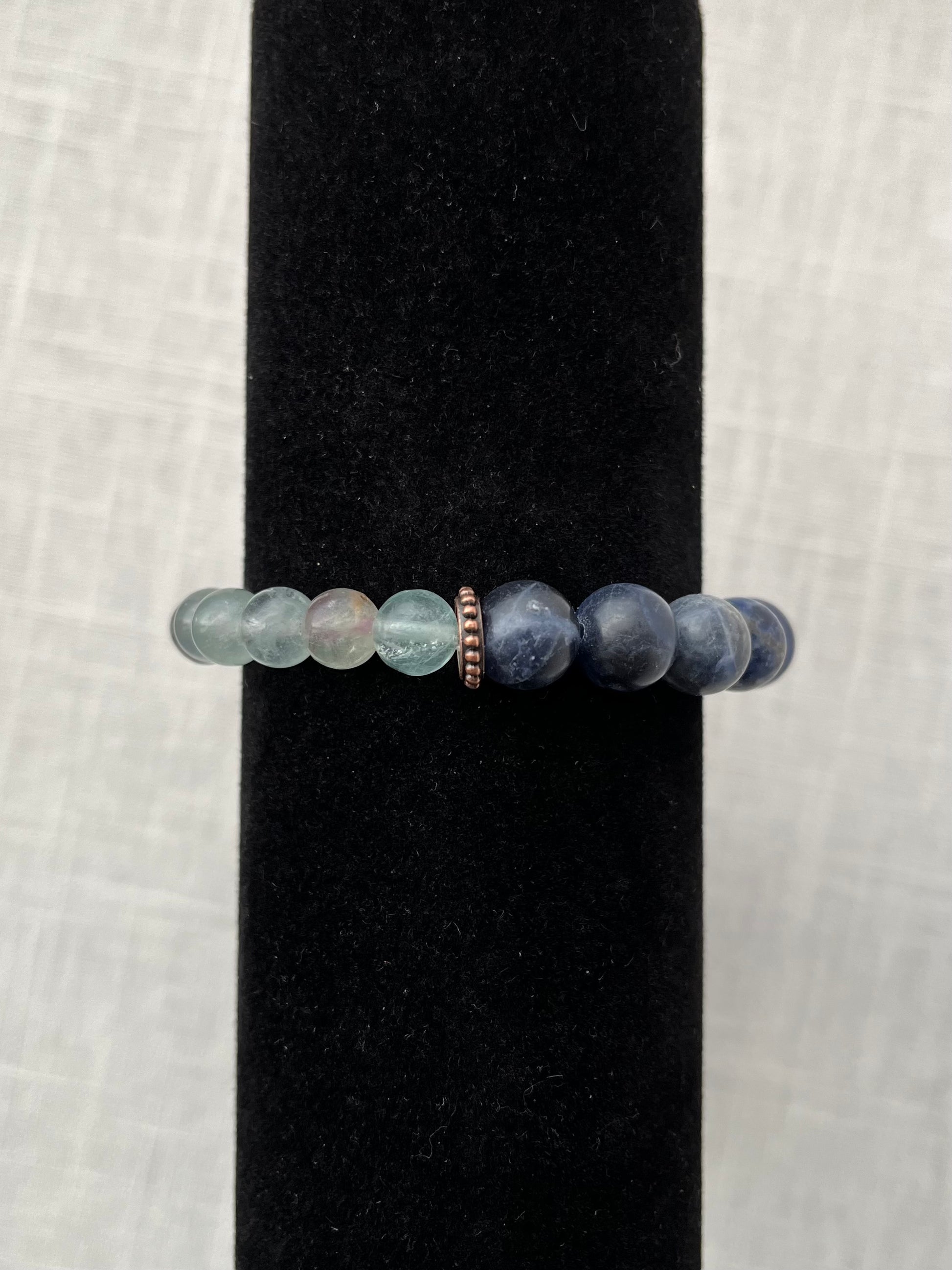 This bracelet fits 7.5” wrists or smaller. Fluorite beads are 8mm. Sodalite beads are 10mm.