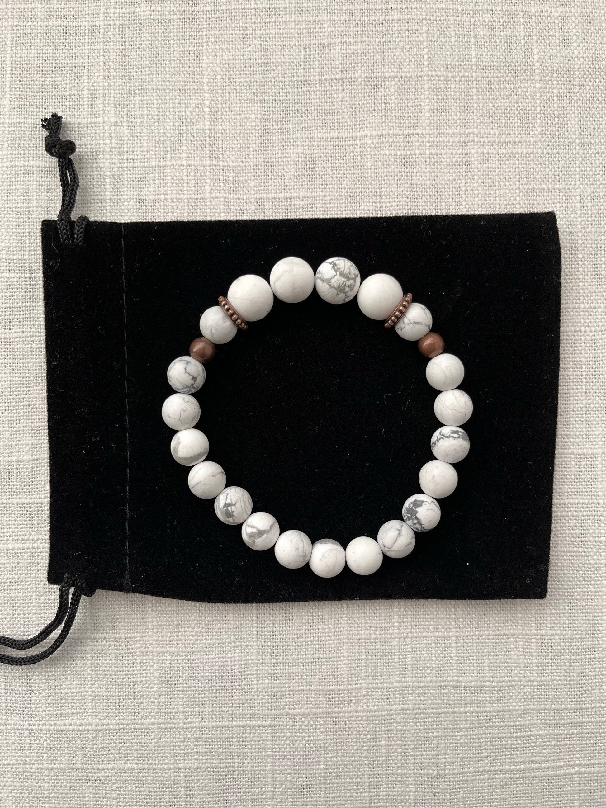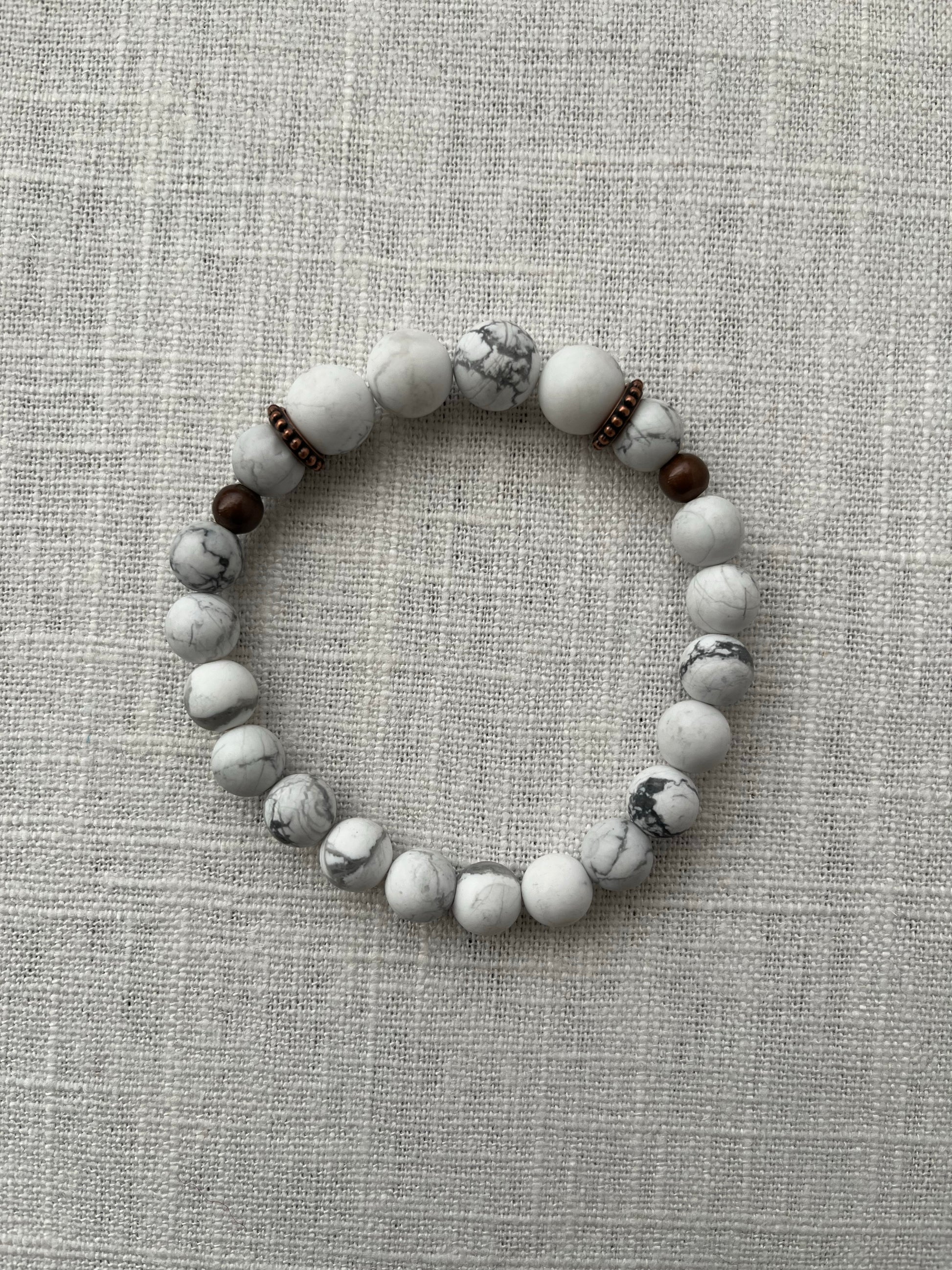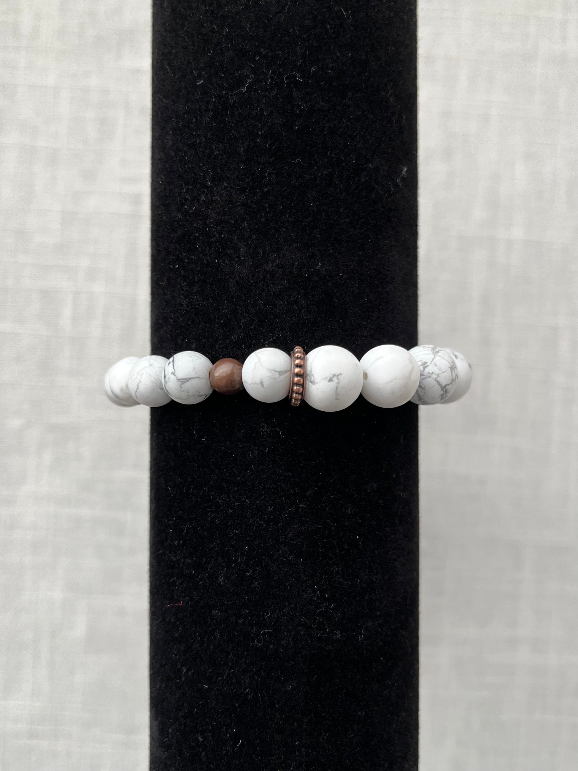 This bracelet fits 7.5” wrists or smaller. Howlite beads are 10mm and 8mm.