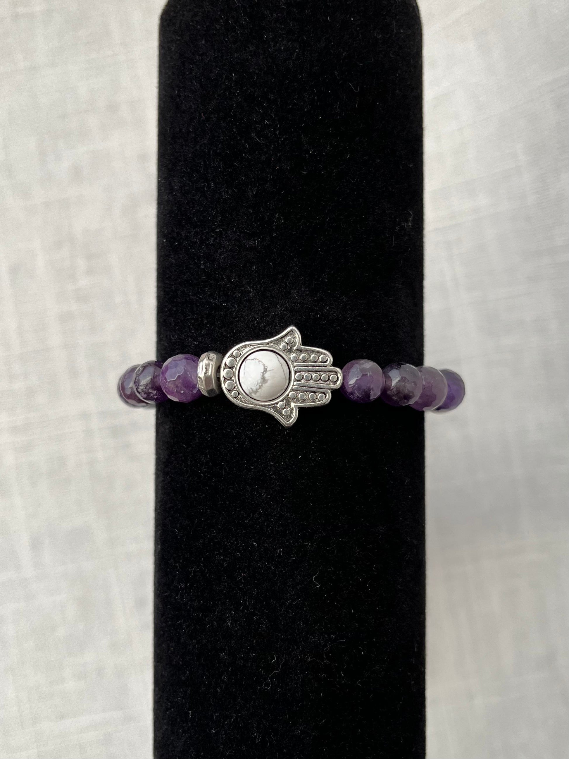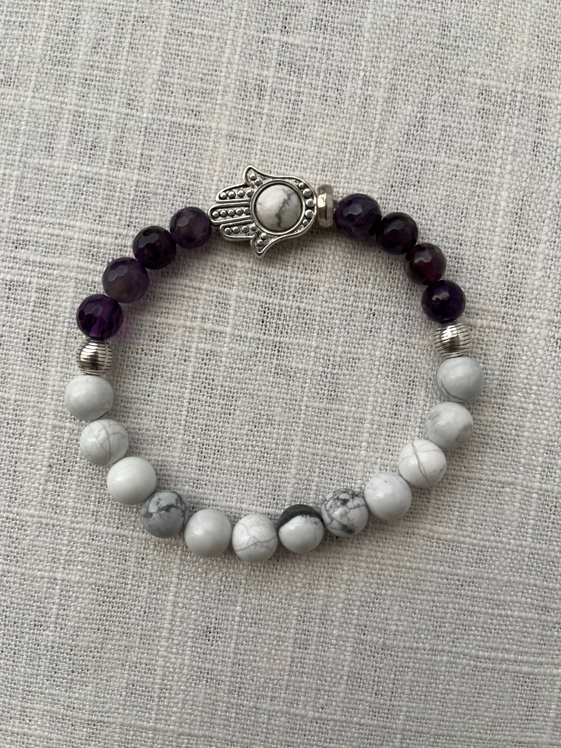 Howlite is a staple for those who seek relief from anxiety and stress. Howlite will connect to your third eye chakra to bring you patience, wisdom, and overall calming energy. Amethyst attracts peace of mind, abundance, and emotional balance. It connects with the crown chakra for spiritual wisdom. The hamsa hand on the bracelet symbolizes happiness, luck, good fortune, and protection.