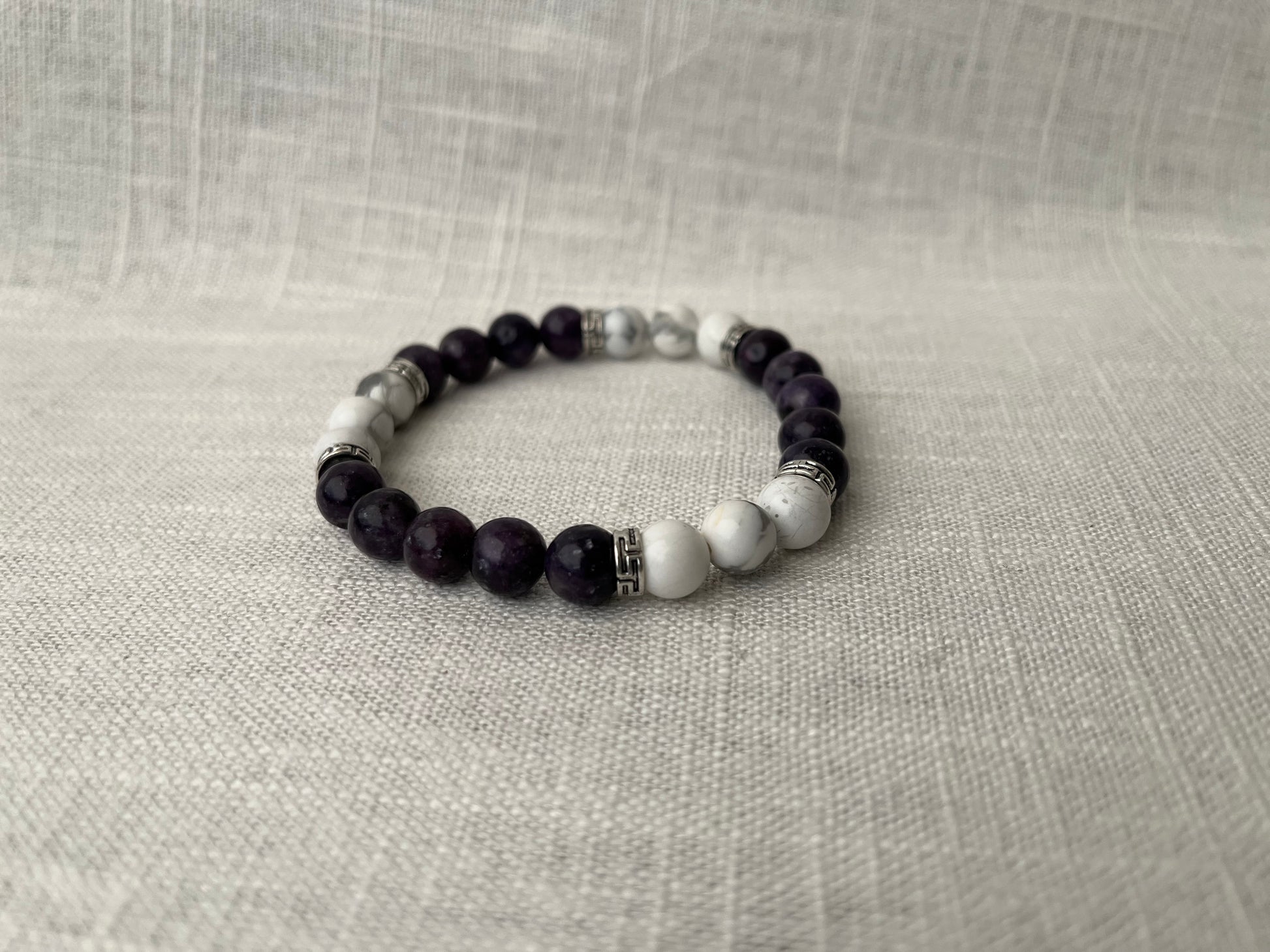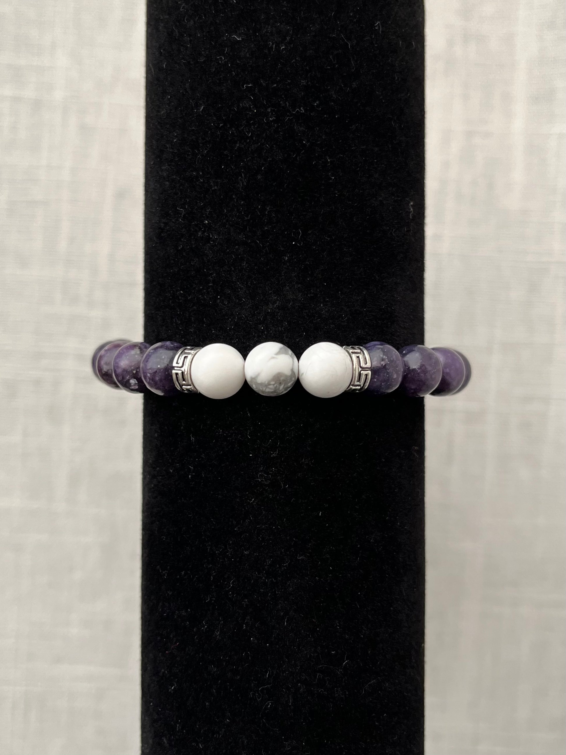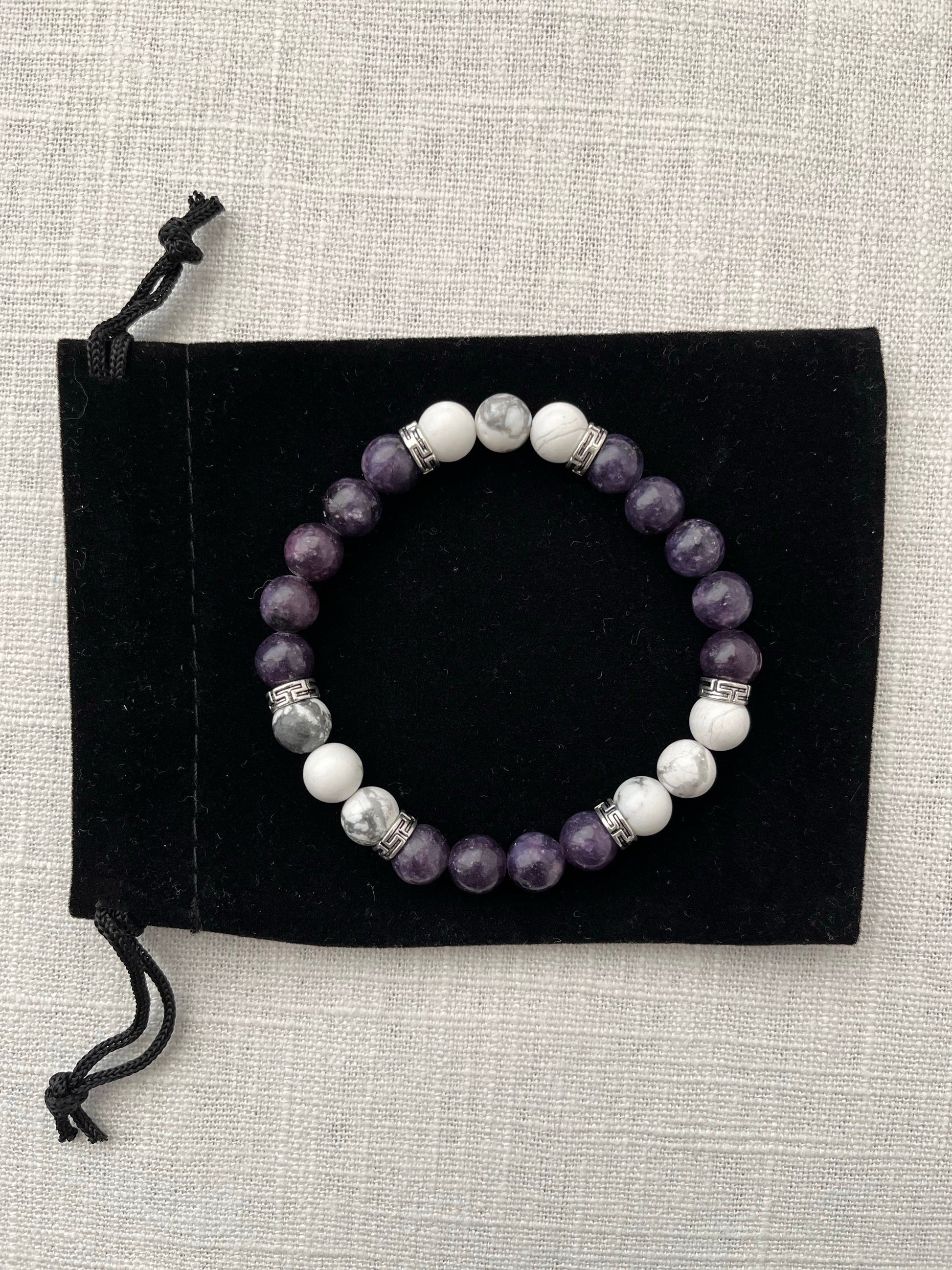 This bracelet fits 7.5” wrists or smaller. Howlite and lepidolite beads are 8mm.