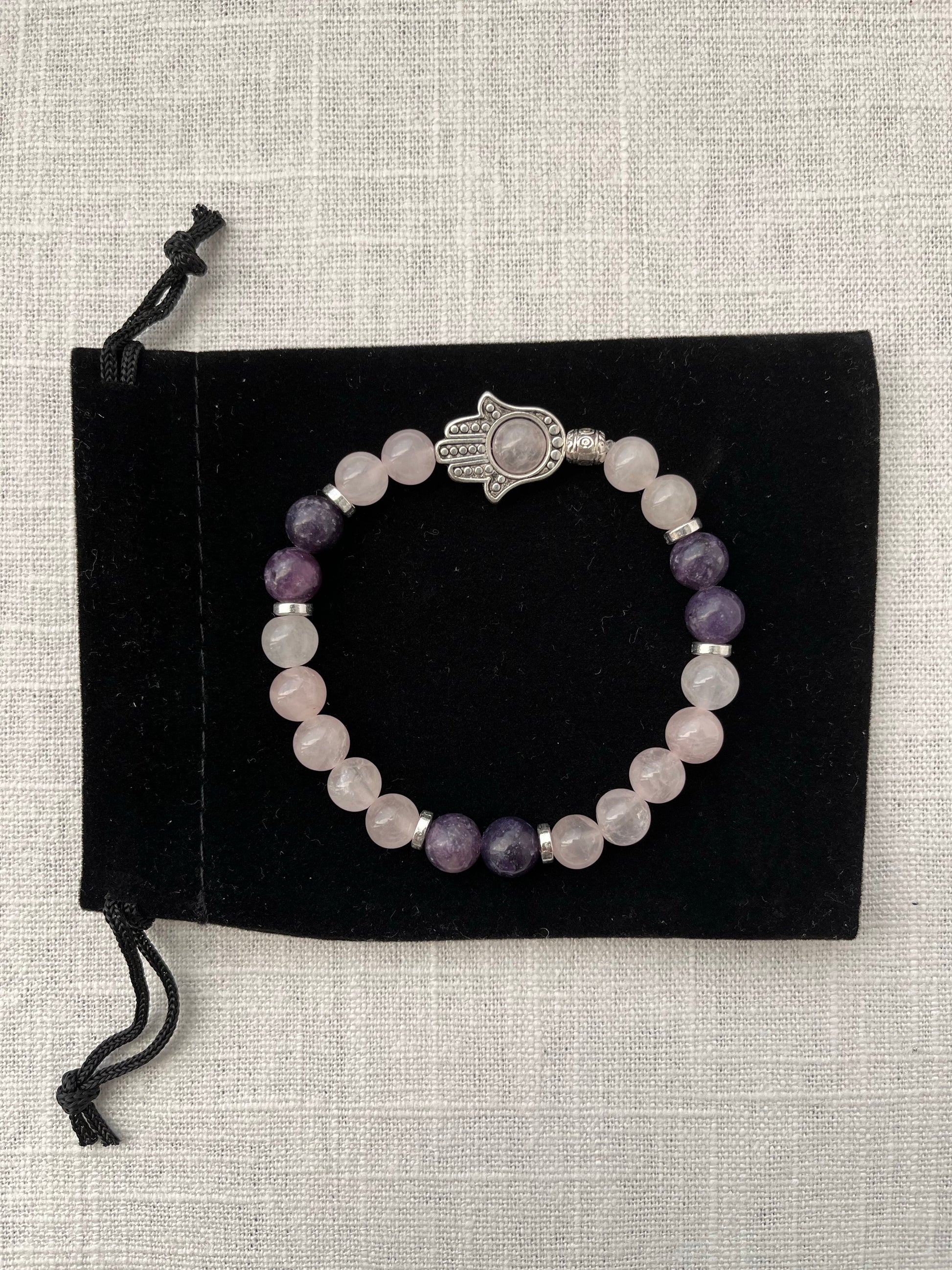 Lepidolite is a game-changer for anxiety and stress relief because it contains lithium. This crystal will rework old behavioral patterns and encourage clarity in decision-making. It also brings about reconciliation and cosmic awareness. Rose quartz is the ultimate love stone. Not only does it connects with unconditional love for others, but it connects with increasing self-love and self-worth. Let this crystal restore your trust and bring you harmony. The hamsa hand on the bracelet symbolizes happiness, luck, good fortune, and protection.