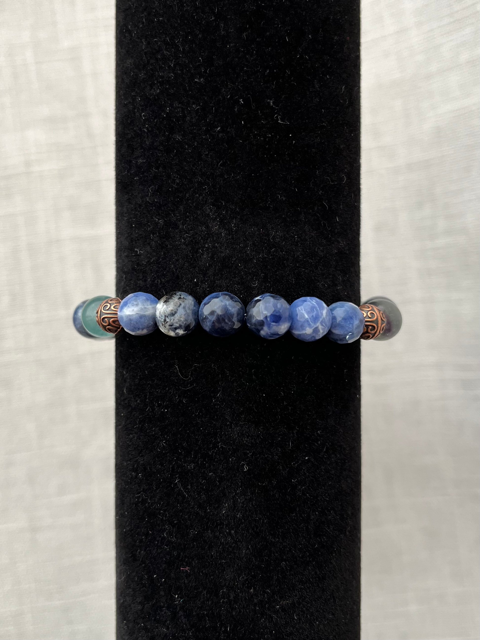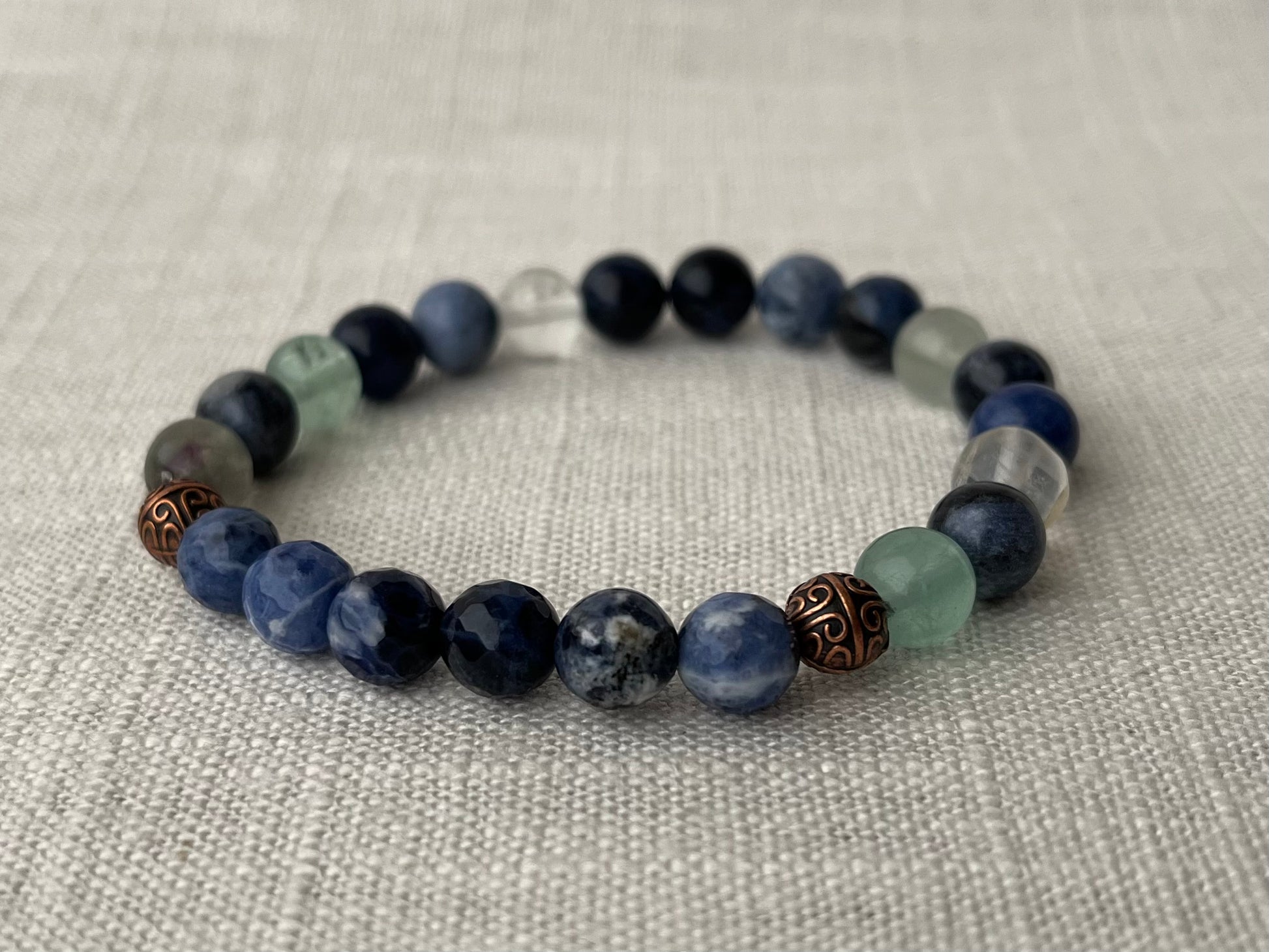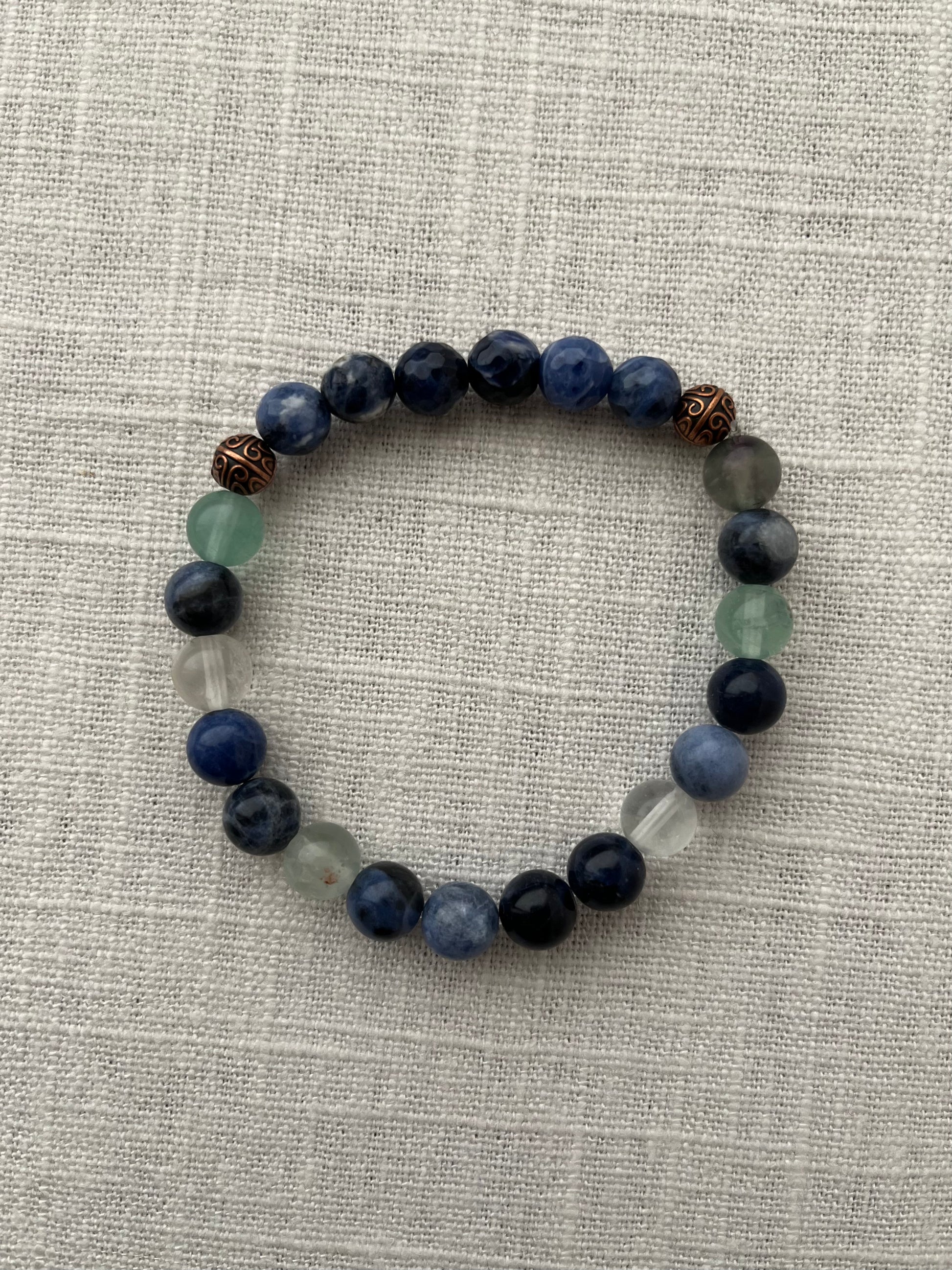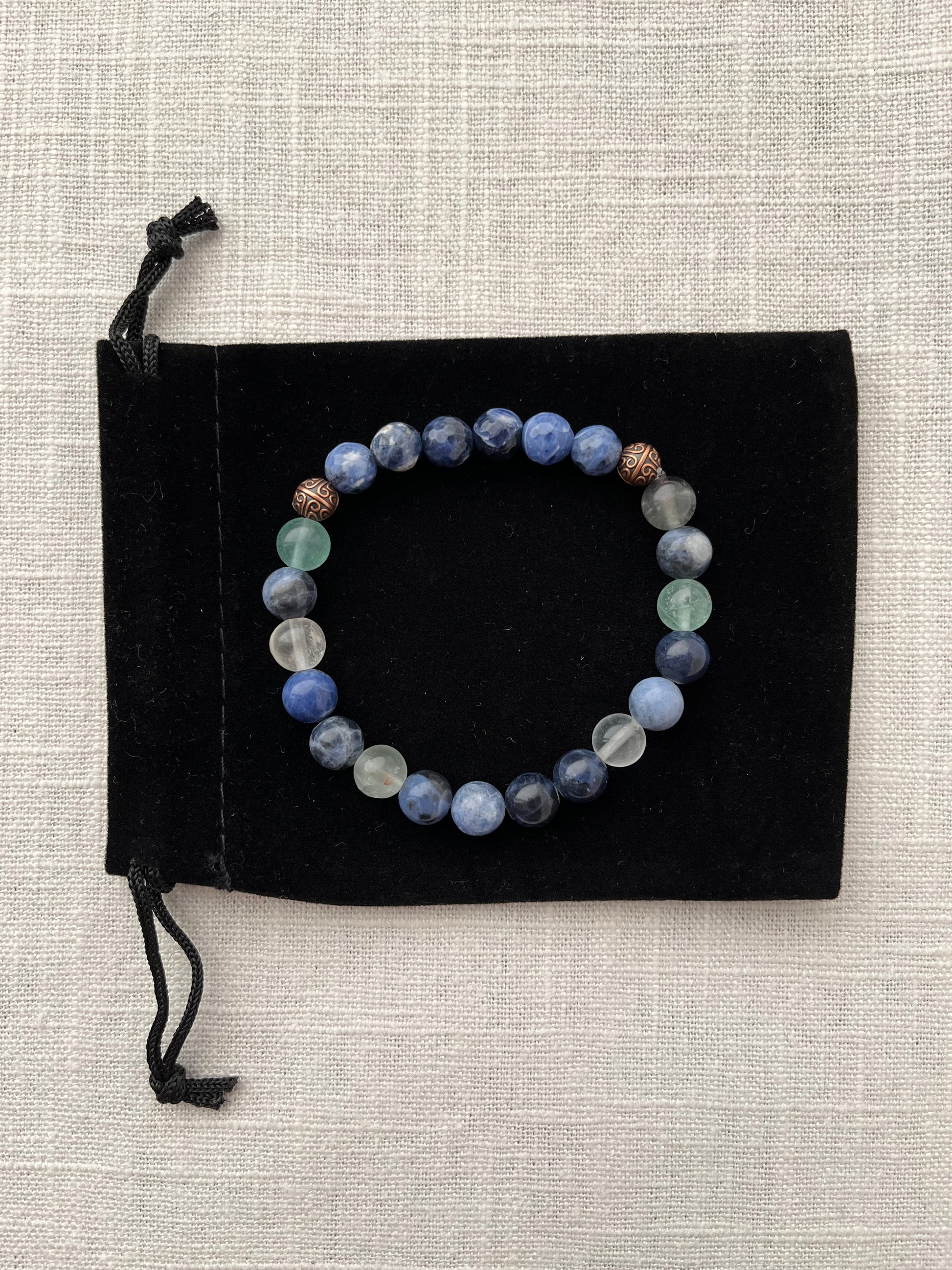 This bracelet fits 7.5” wrists or smaller. Fluorite and sodalite beads are 8mm.