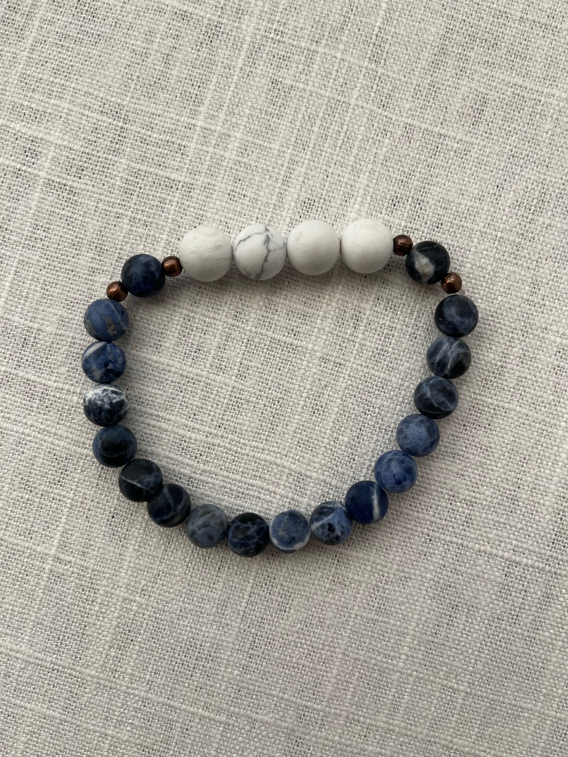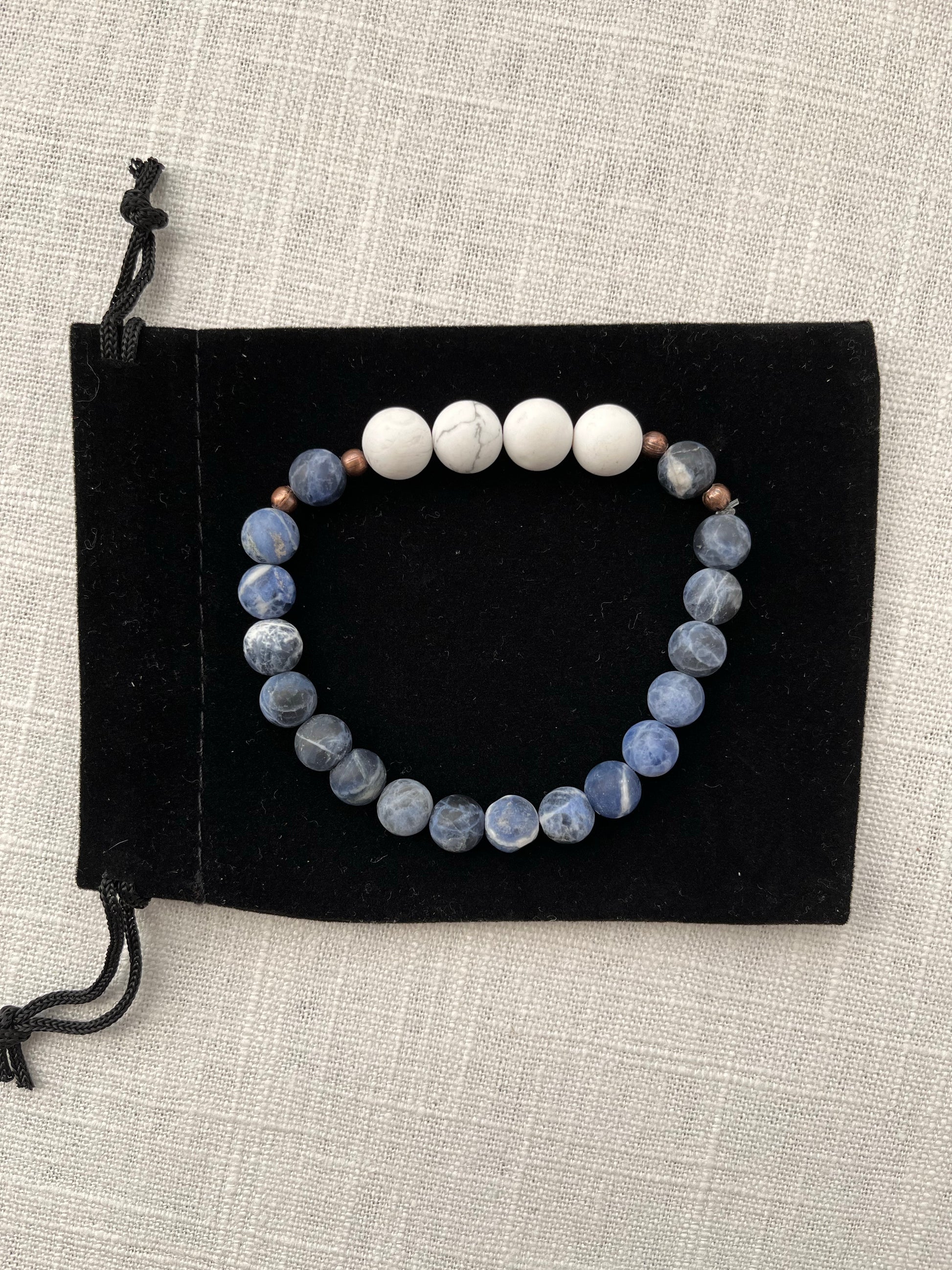 This bracelet fits 7.5” wrists or smaller. Sodalite beads are 8mm and howlite beads are 10mm.