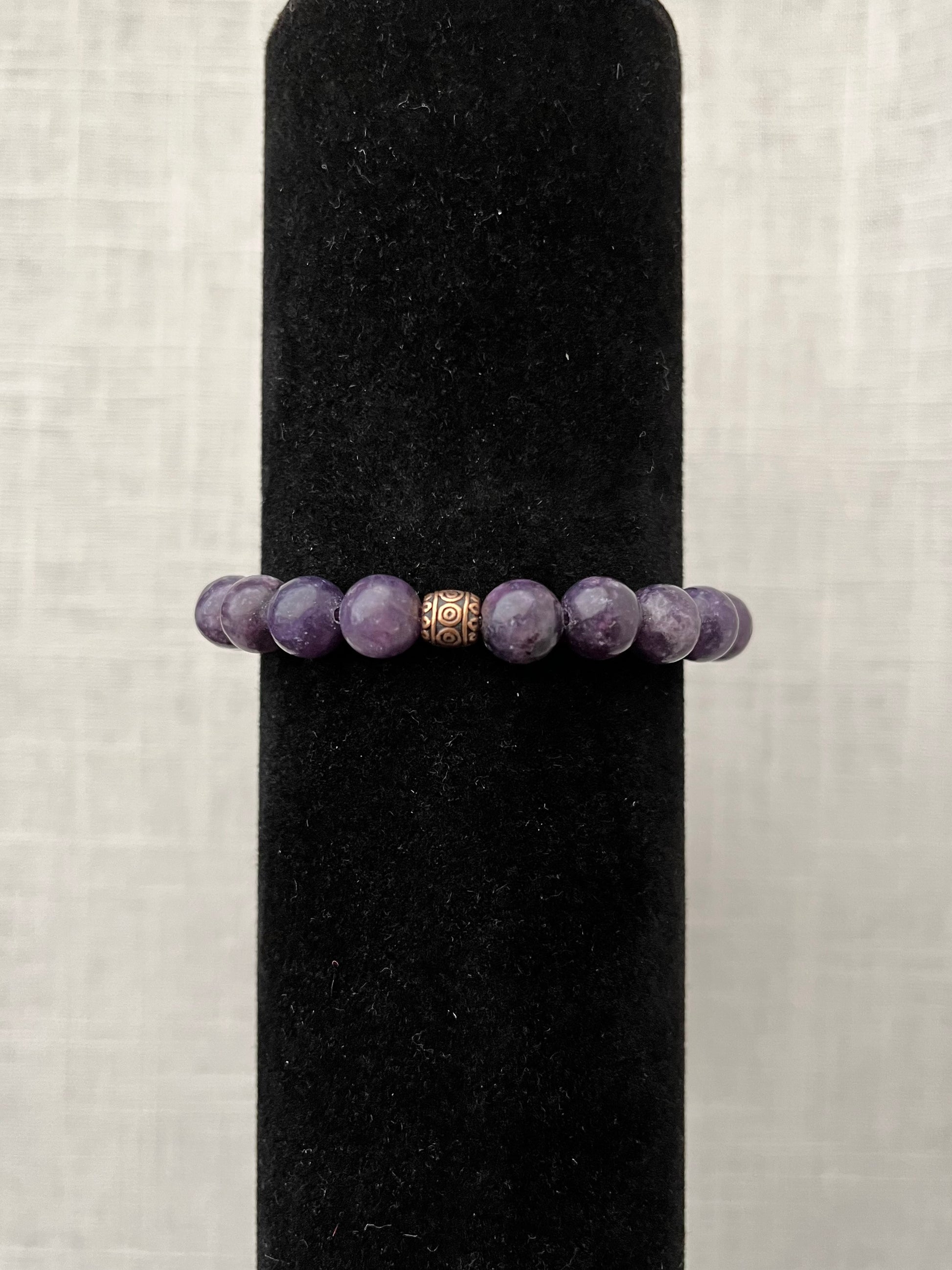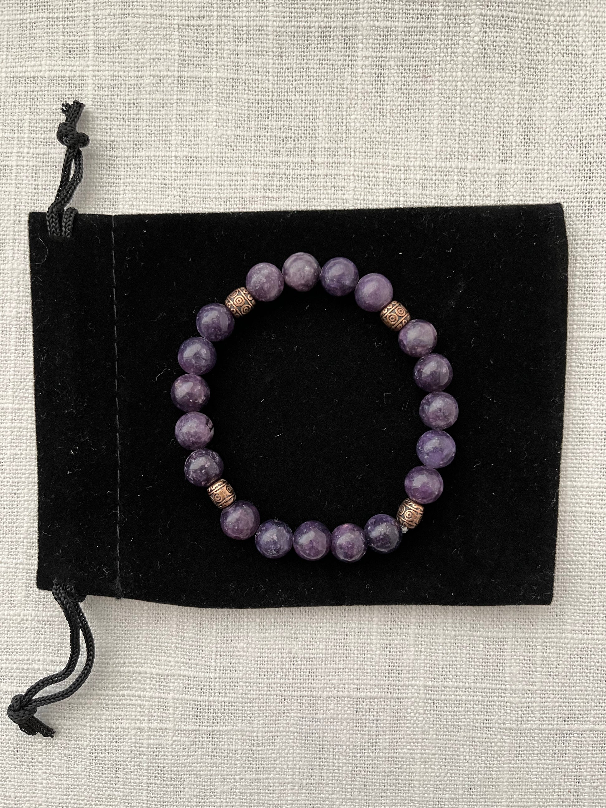 This bracelet fits 7” wrists or smaller. Lepidolite beads are 8mm.